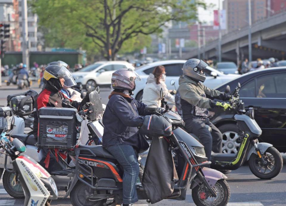 4月23日,东三环中路辅路双井桥下,电动车骑行者佩戴头盔出行。