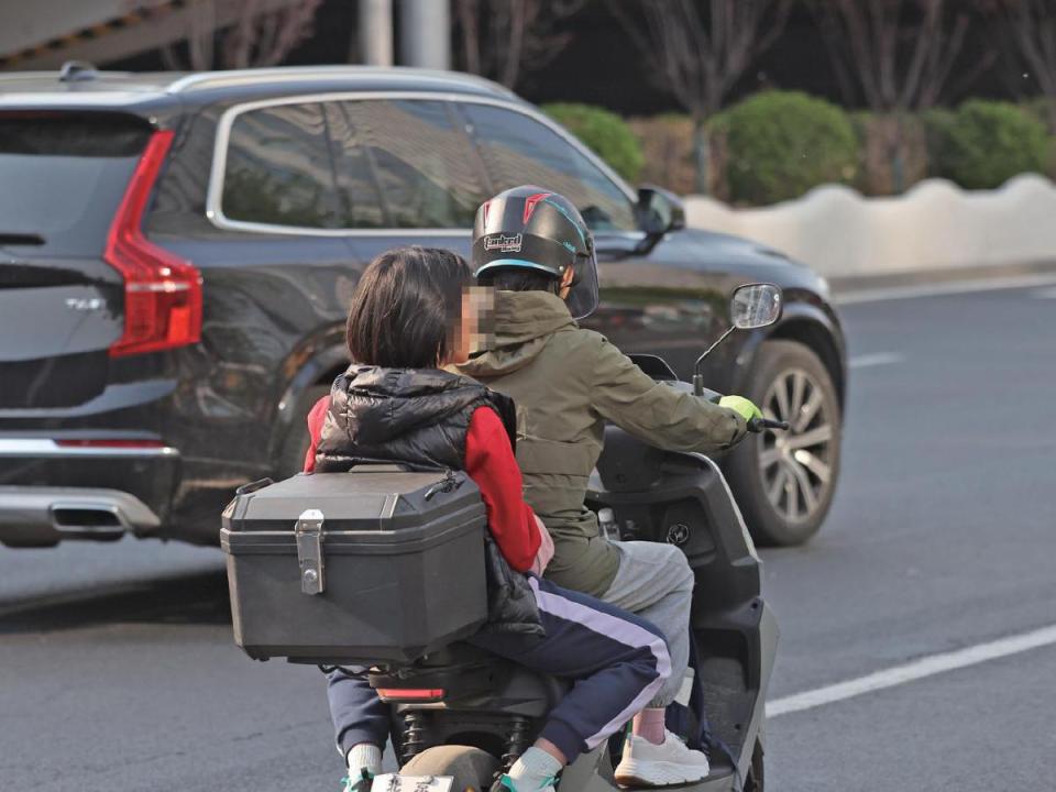 家长戴头盔后座孩子却没防护措施